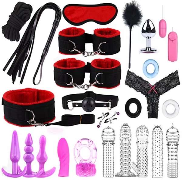 В наборе вы найдете все необходимое для разнообразных БДСМ сессий. Он включает в себя мягкие очки на резинке, наручники, наножники, плетки, вагинальное виброяйцо диаметром 2,5 см на пульте управления, анальную металлическую пробку с розовым стразом диаметром 2,5 см, веревку длиной 1 м, стек пуховку, кружевные трусики, кляп шар с отверстиями для вентиляции, 6 насадок на член, ошейник с поводком, зажимы для сосков с шариками, 2 эрекционных кольца, 1 эрекционное виброкольцо и 3 рельефных анальные пробки.