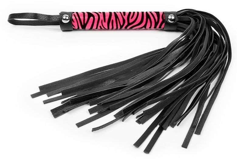 Черная многохвостовая плеть с круглой розовой ручкой-зеброй - 39 см.