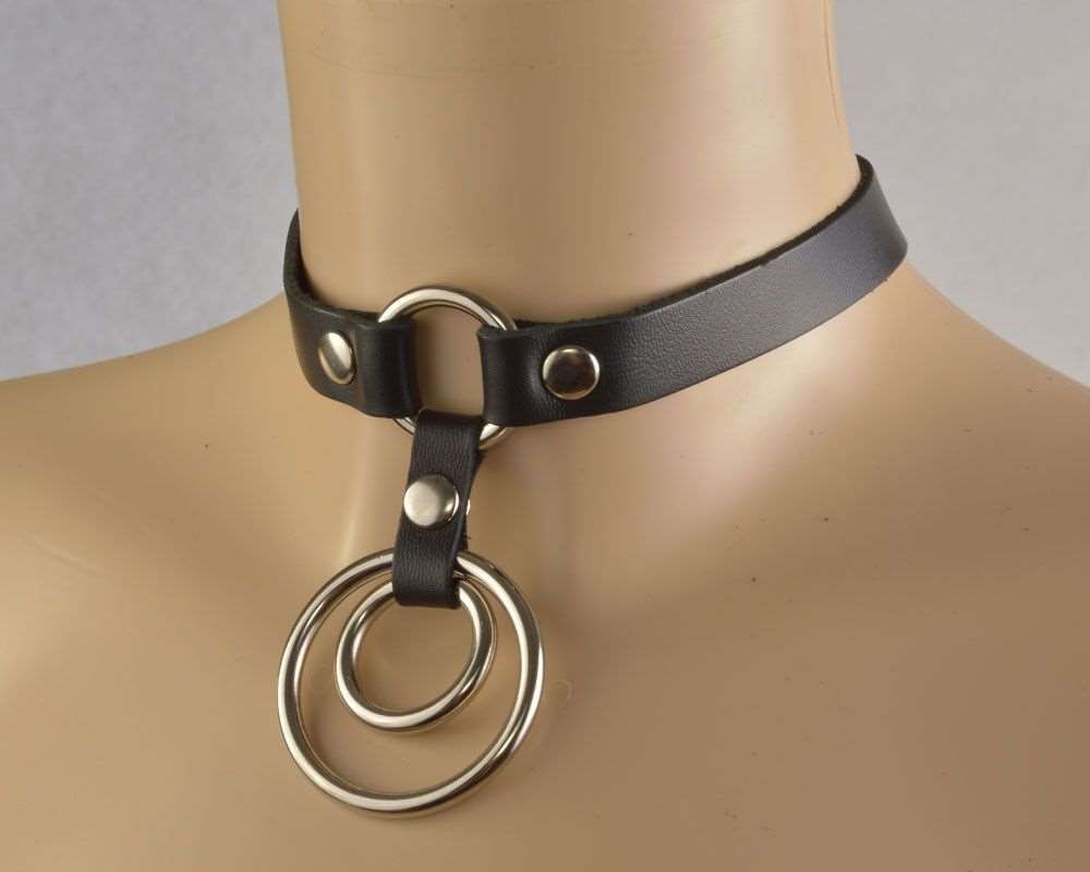 Чокер с двойным кольцом из натуральной кожи черного цвета с возможностью регулировки длины с помощью металлических кнопок.