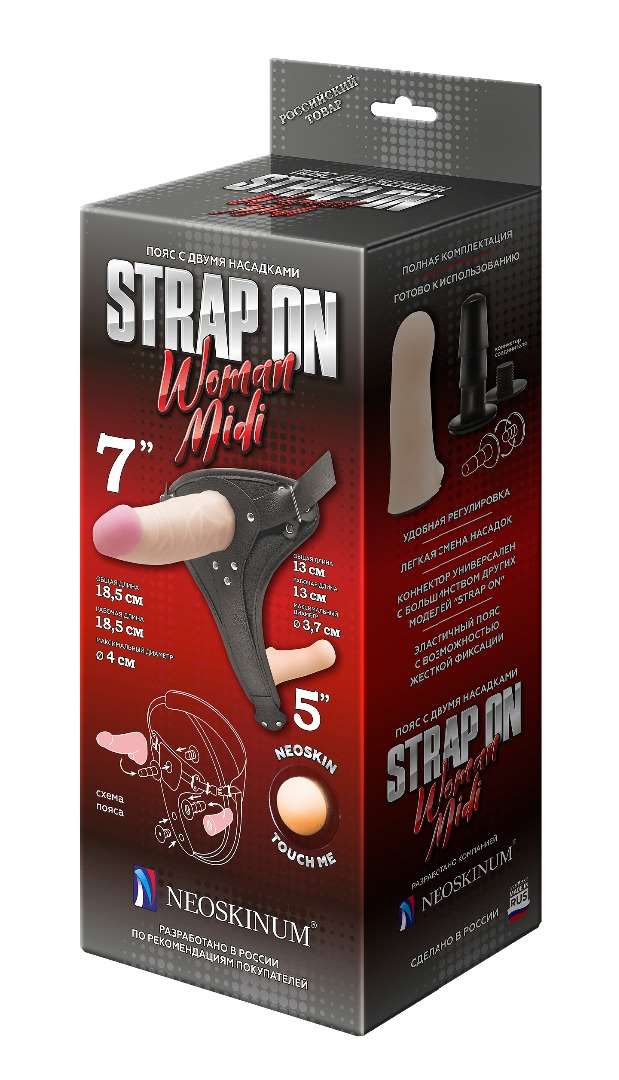 Продукт поставляется в стильной квадратной коробке с приглушенной черно-серой цветовой гаммой и красными акцентами. На передней стороне коробки изображение насадок, а также надпись "STRAP ON" и маркировка, указывающая на наличие двух насадок. Подпись "Полная комплектация" означает доступность всех составляющих элементов.